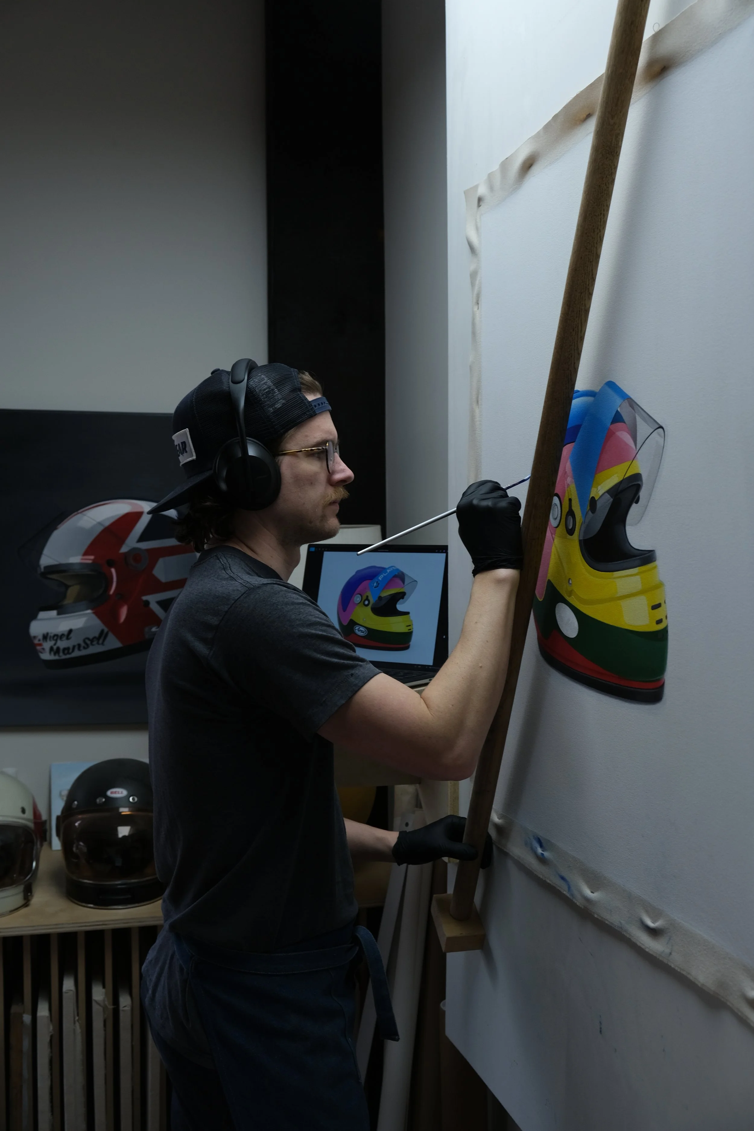 That background led him to explore helmet paintings as art. Each helmet represents the story of a person, a time, and a place - and evokes different memories for each individual who views it. The art he creates utilizes his design background and experience with helmet design to celebrate and memorialize moments in racing history.